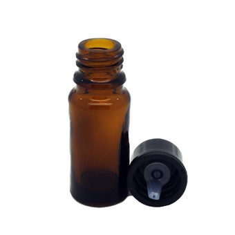 10ml Amber Glass Bottle, narrow neck (GL18), including black cap and internal dropper.Accessories: White lids or white glass bulb pipette to fit this bottle can be bought separately, see 'Inserts & Caps'. For a more modern look see our Aluminium Lids.